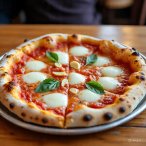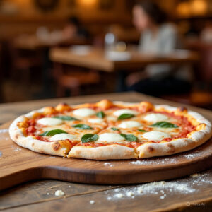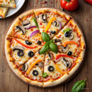 A golden, hand-stretched crust topped with smoky BBQ sauce, melted mozzarella, tender chicken, and fresh vegetables, creating a rich and flavorful American-style BBQ pizza.