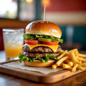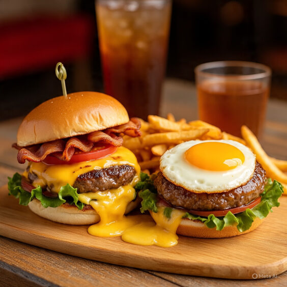 Juicy beef patty loaded with melted cheese, bacon, and fresh veggies.Served in a soft bun with a rich, savory sauce.