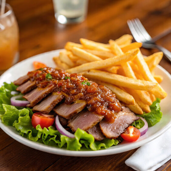 Tender slices of seasoned doner meat served with golden, crispy fries.Juicy, flavorful, and perfectly balanced.