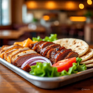 Tender doner meat served sizzling hot with vegetables and sauces.